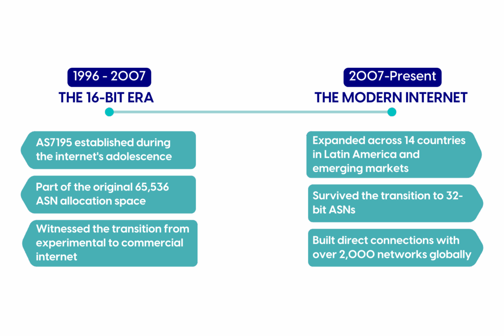 El 7 de octubre de 1996, cuando se registró por primera vez el AS7195, Internet era un lugar fundamentalmente diferente. Con menos de 5.000 sistemas autónomos en todo el mundo, cada ASN representaba una pieza importante de la infraestructura troncal de Internet. Hoy, cuando celebramos las tres décadas de AS7195, Internet se ha expandido a más de 120.000 ASN asignados, un testimonio del explosivo crecimiento de la conectividad global.
