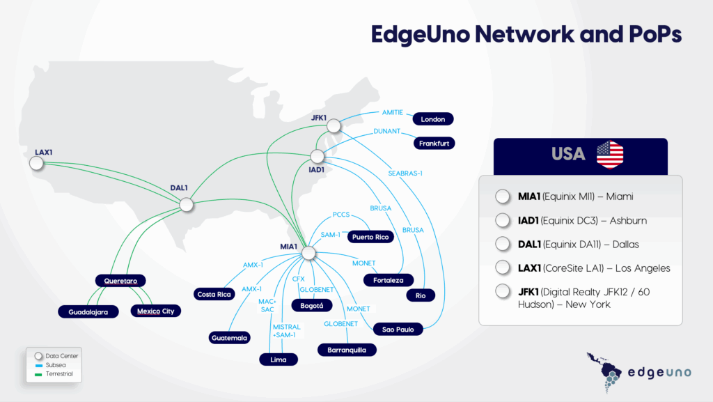 From Miami, New York, and Dallas to Los Angeles and Ashburn, our network is strategically positioned in the most critical internet hubs of the United States. Whether expanding regionally, entering Latin America, or optimizing global delivery, EdgeUno gives you the foundation to scale securely and efficiently.